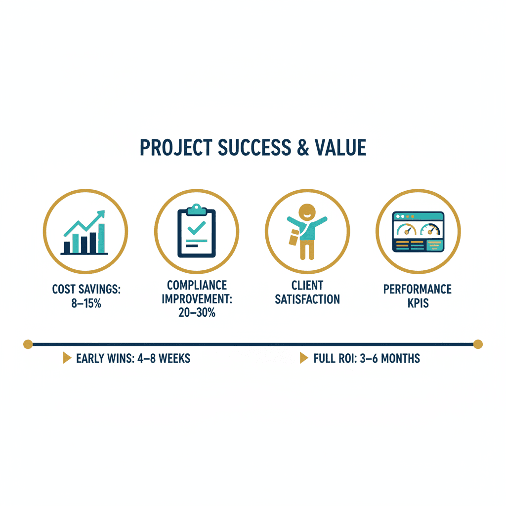 A. Most clients see early wins within 4–8 weeks—such as process improvements or quick cost savings. Full program ROI is typically realized within 3–6 months, and we provide regular progress updates so you’re never in the dark.