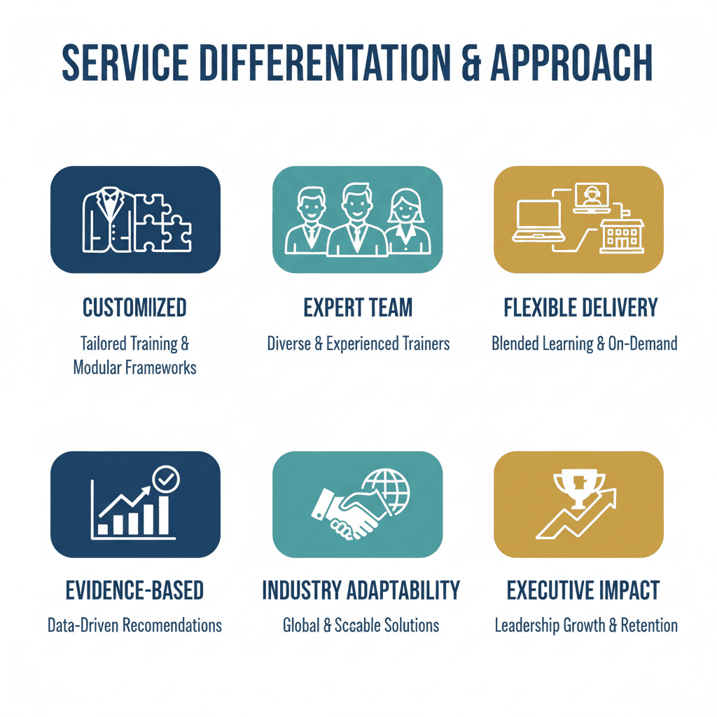 A. Our training is tailored to your business, delivered by sector experts, and focused on measurable outcomes (like guest satisfaction, compliance, or revenue). We blend in-person, virtual, and e-learning for maximum flexibility and retention, with post-training follow-up to ensure results stick.