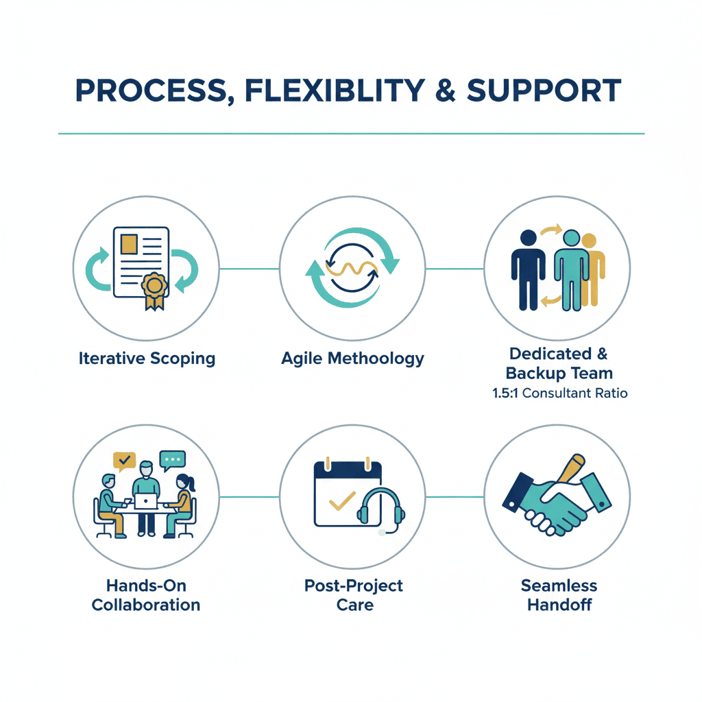 A. Your team is involved throughout, with regular check-ins, co-created solutions, and hands-on training. After go-live, we offer ongoing support, knowledge transfer, and access to dashboards and resources for at least 12 months.