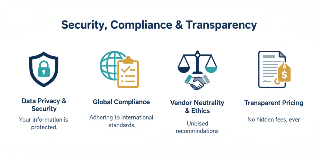 Q. How do you handle conflicts of interest, especially since you’re vendor- neutral?A. We do not accept commissions from suppliers. Our recommendations are unbiased and based solely on your needs. Potential conflicts are disclosed and managed transparently.